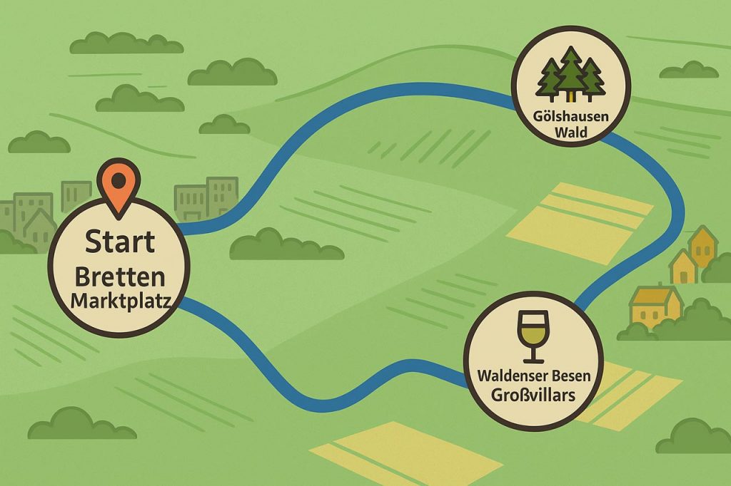 Wir starten am Marktplatz in Bretten. Von dort geht es über Gölshausen, durch den Wald zur Waldenser Besenwirtschaft in Großvillars und zurück über die Felder nach Bretten. Alle weiteren Infos erhältst du nach deiner Anmeldung.